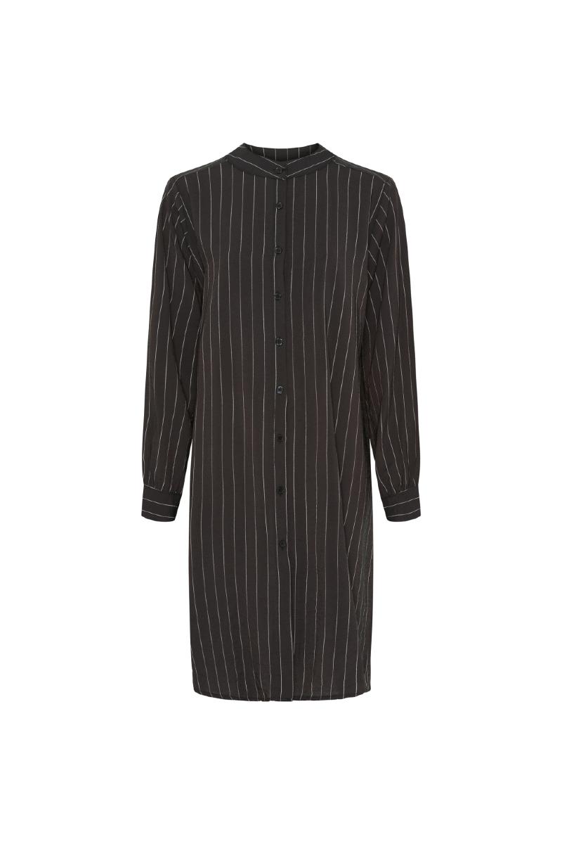 Kritstrecksrandig klänning med knappar.