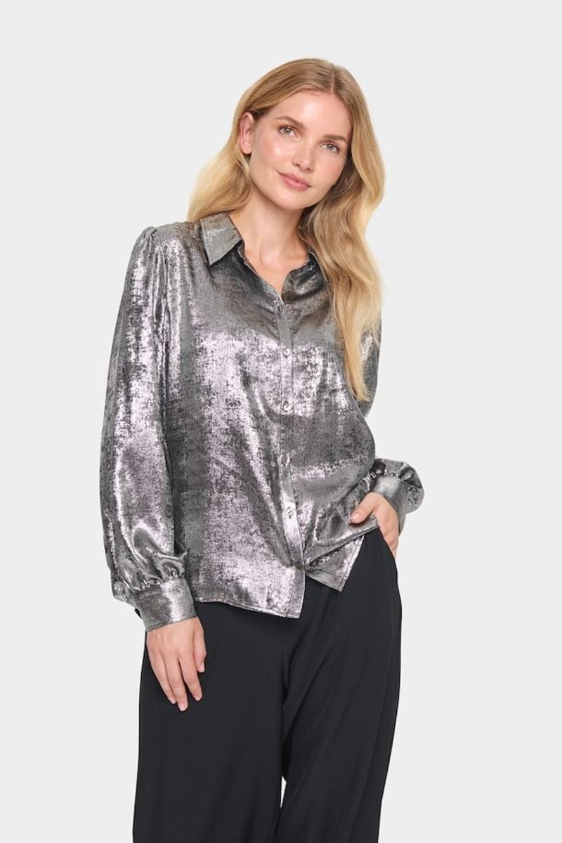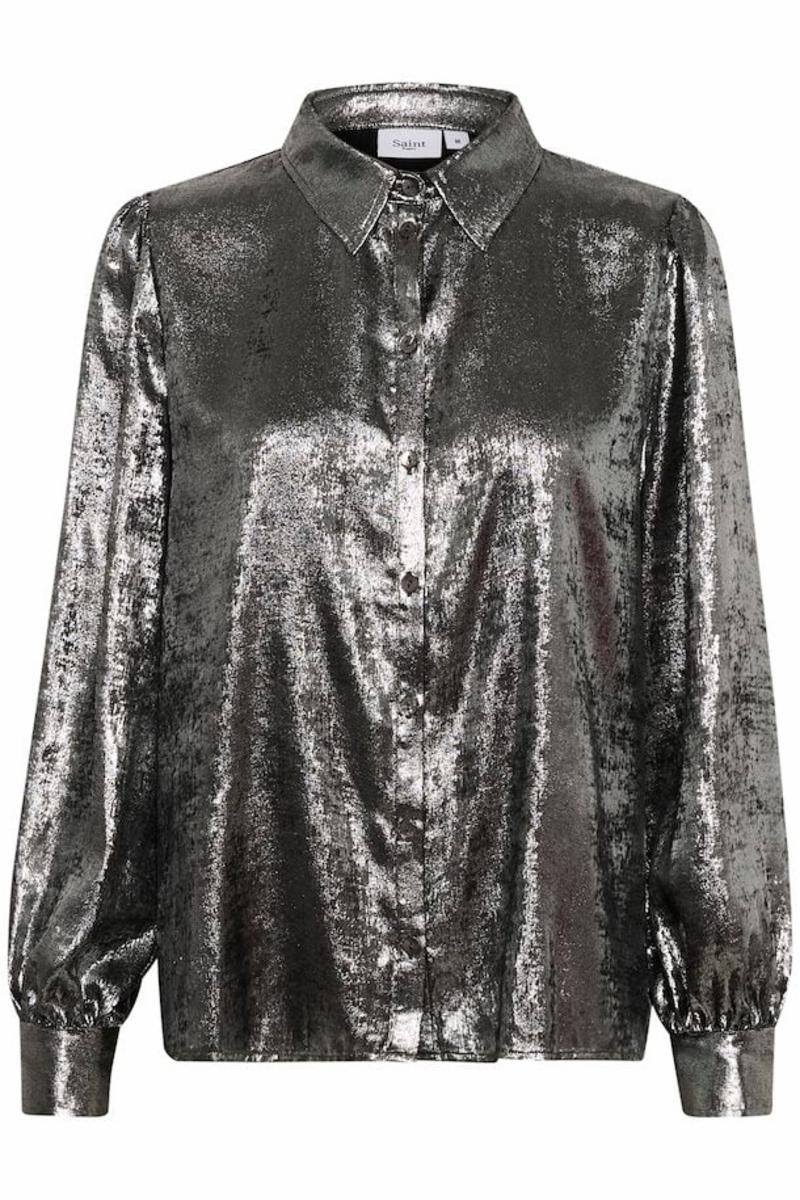 Denna metalliska blus utstrålar glamour med sin glänsande, texturerade finish.