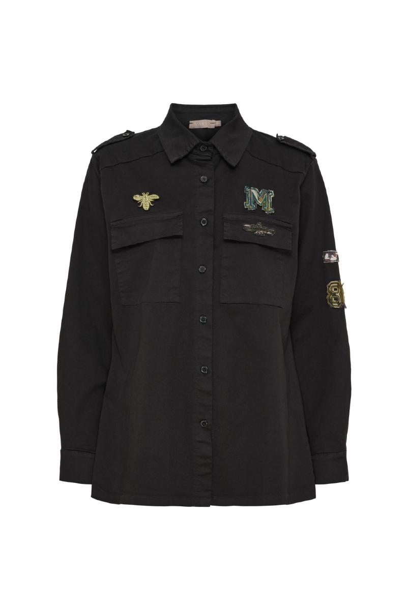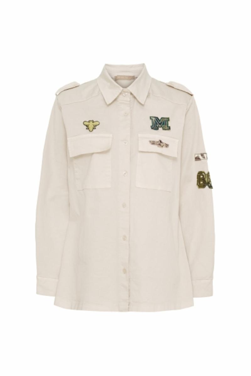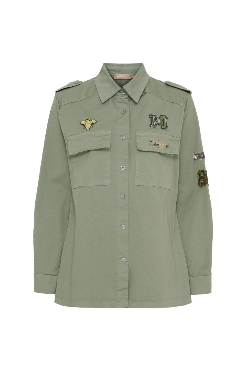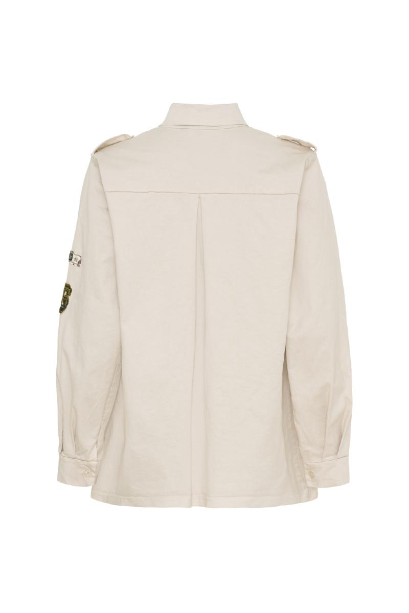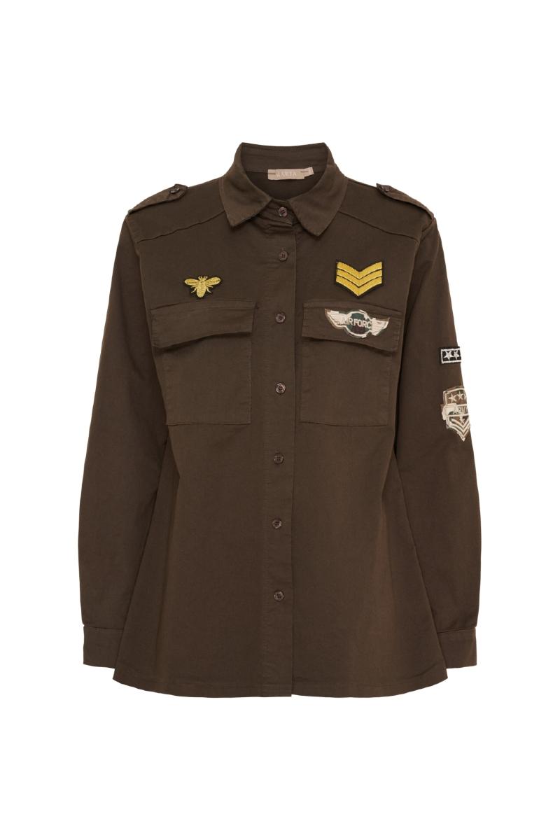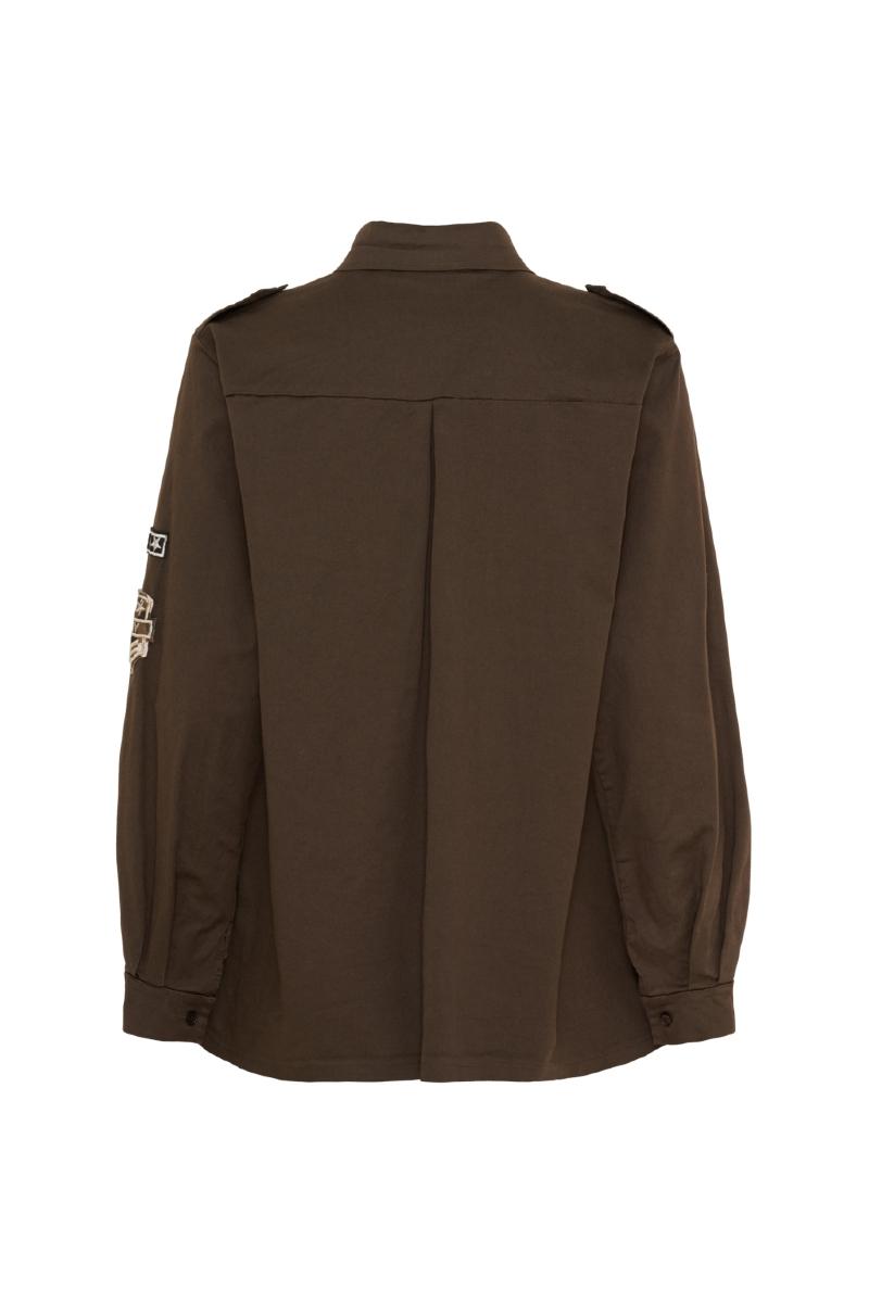 Jacka med knappar och påsydda emblem.