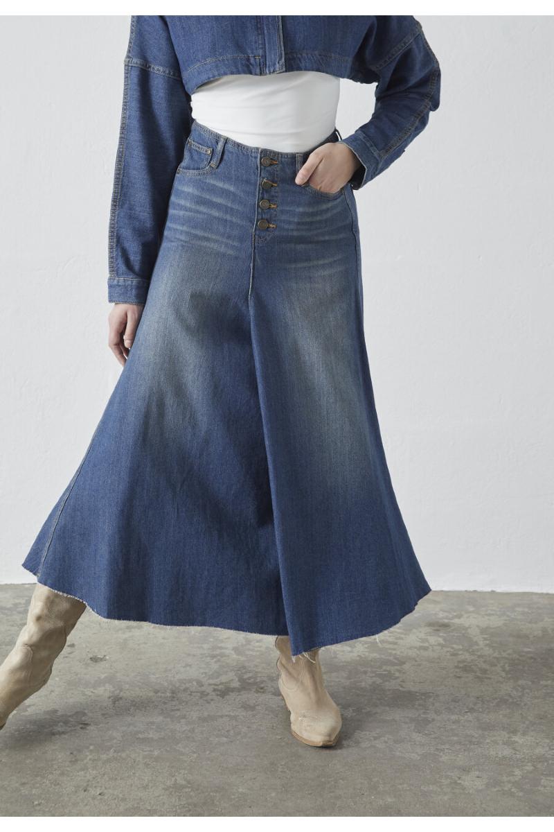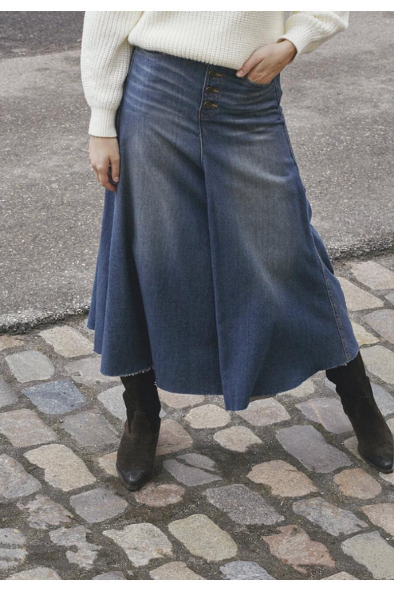 Lång denim kjol med en lätt A-linje.Fickor och knappar.