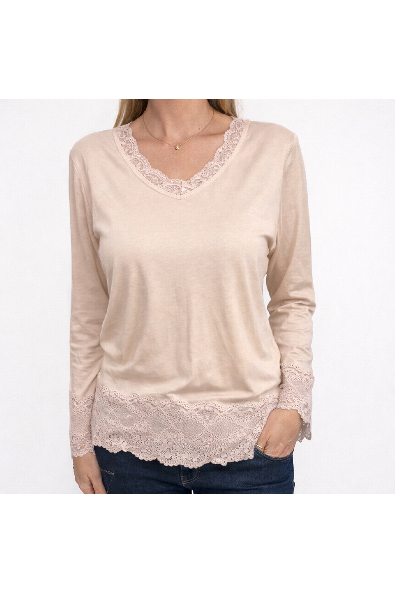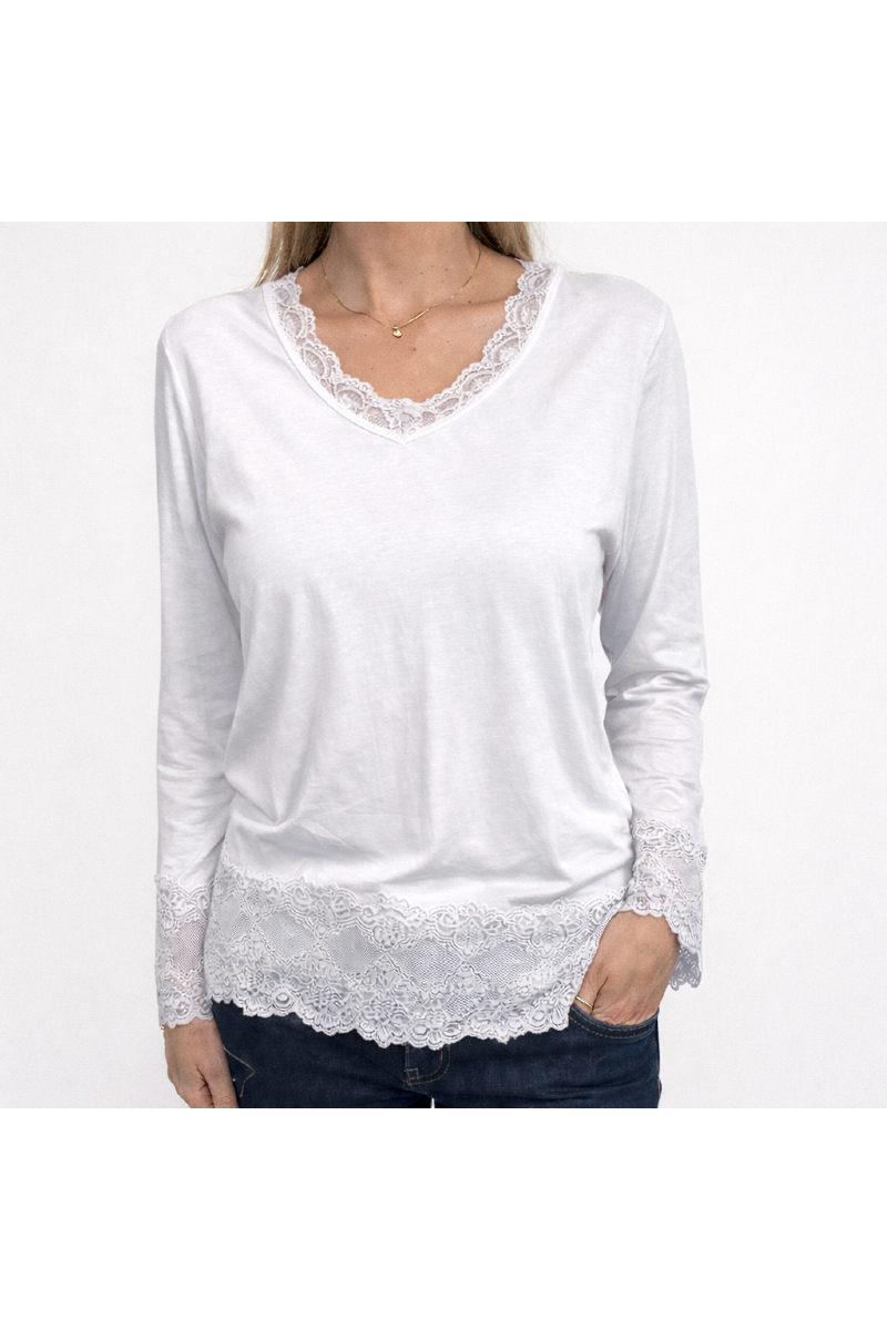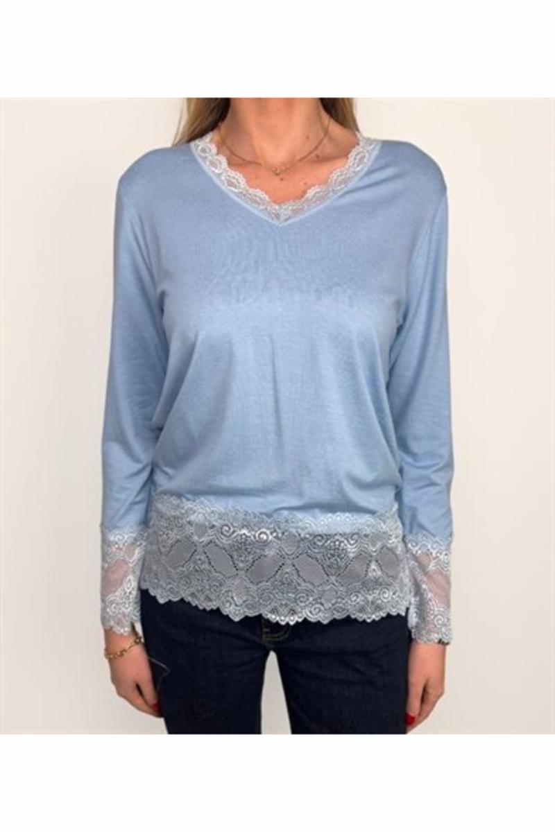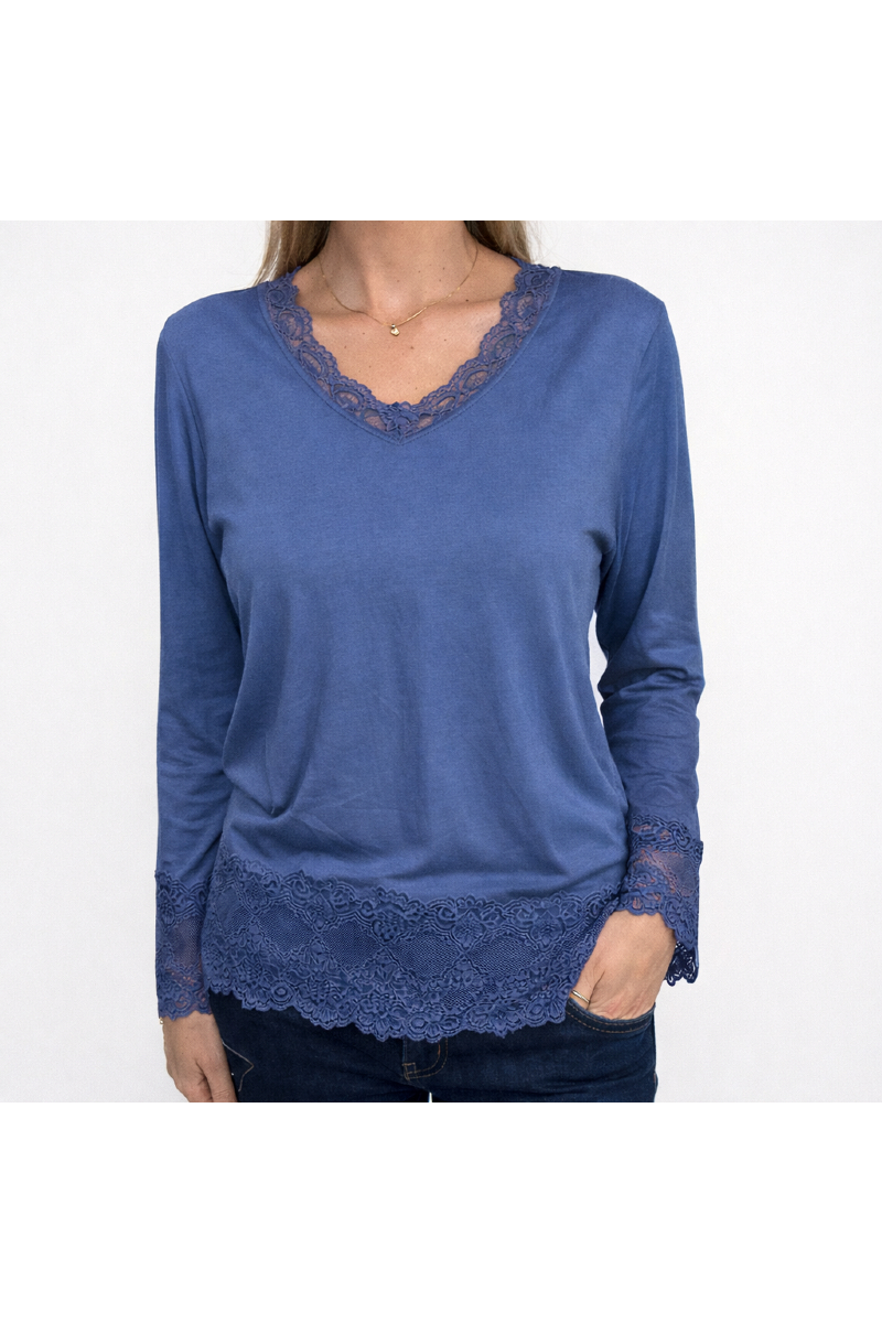 Bred spets nertill och i v-ringningen.