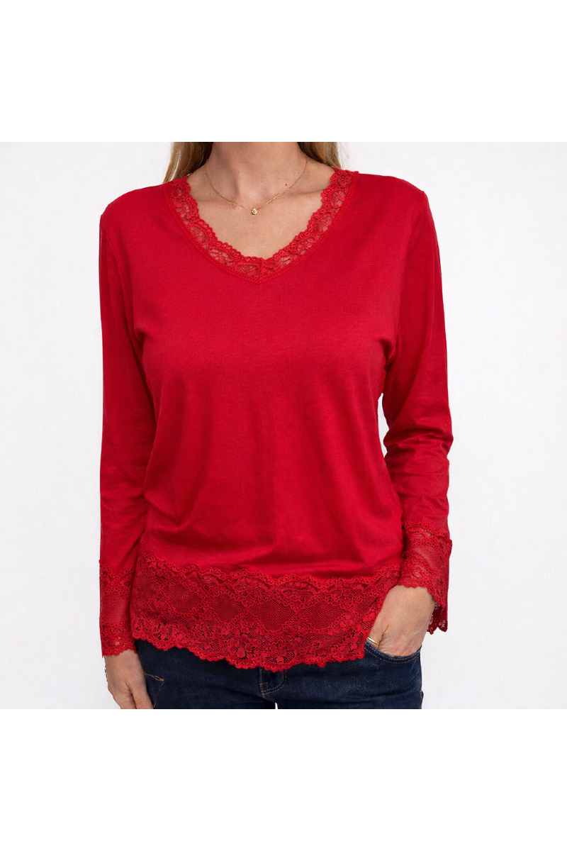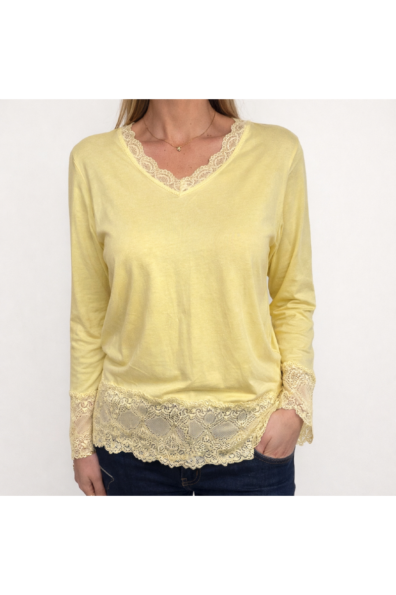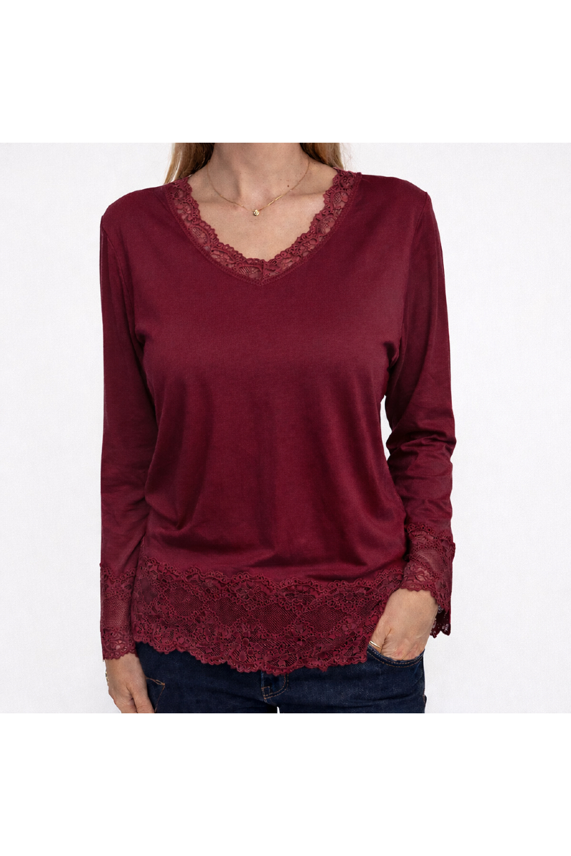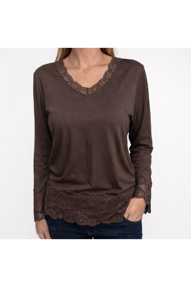 Bred spets nertill och i v-ringningen.