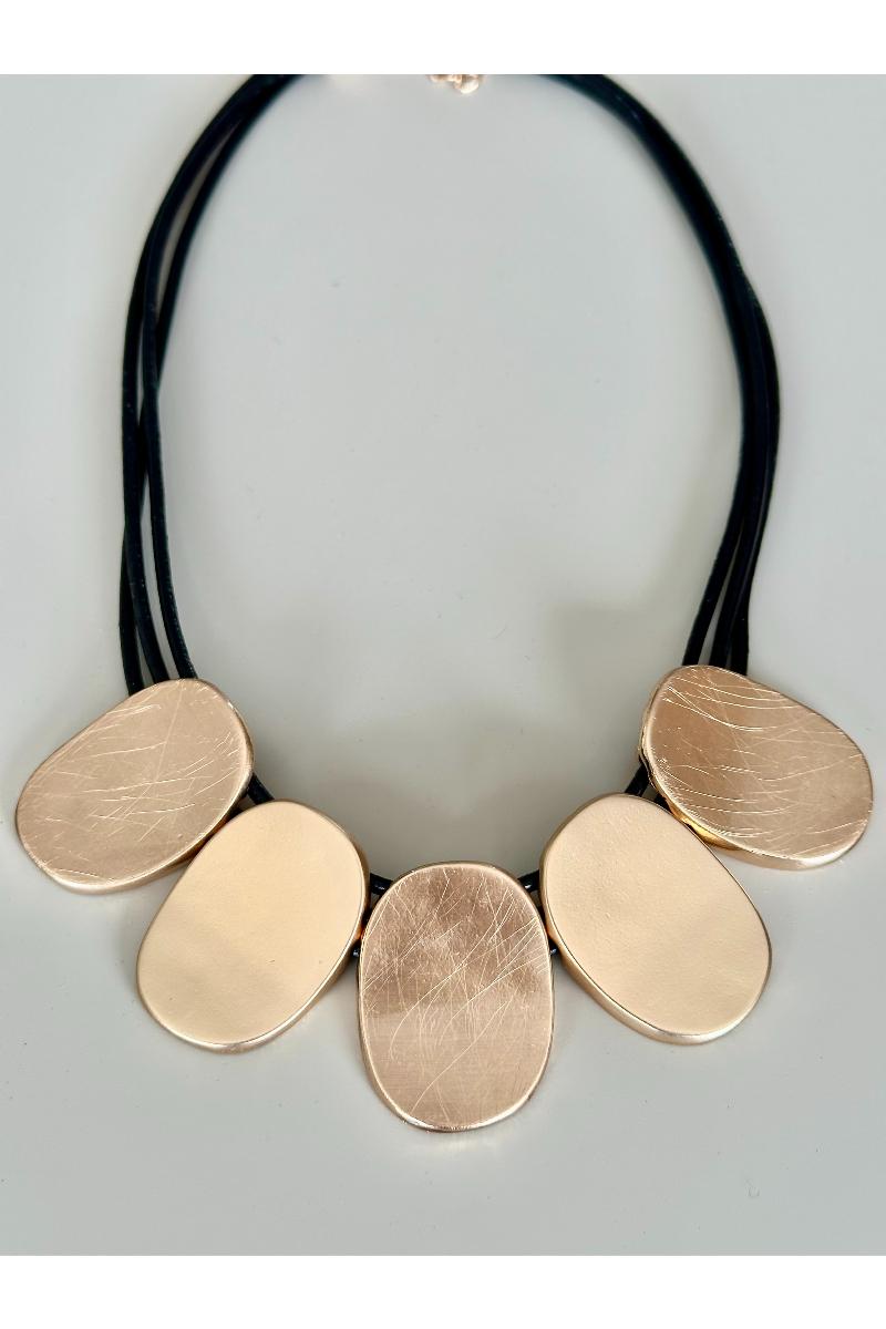Fint halsband med läderrem och plattor.