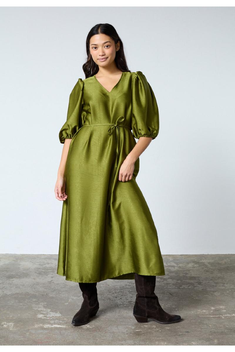 Lång V ringad klänning i satin look.