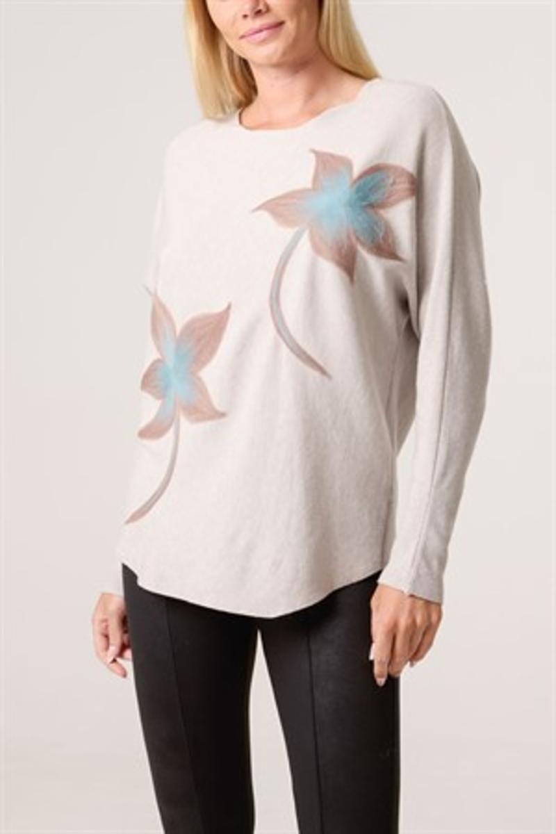 Finstickad tröja med blomstermönster.