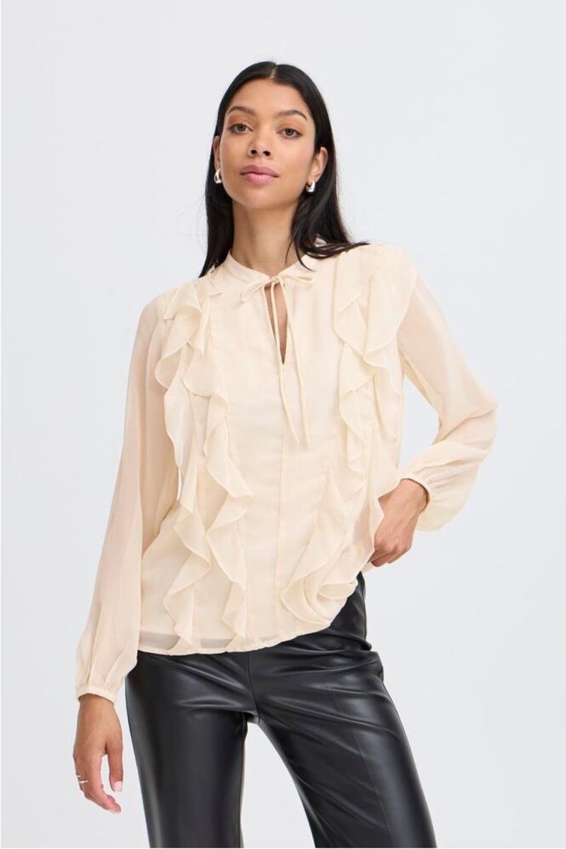 Söt blus med volanger, knyt i halsen.