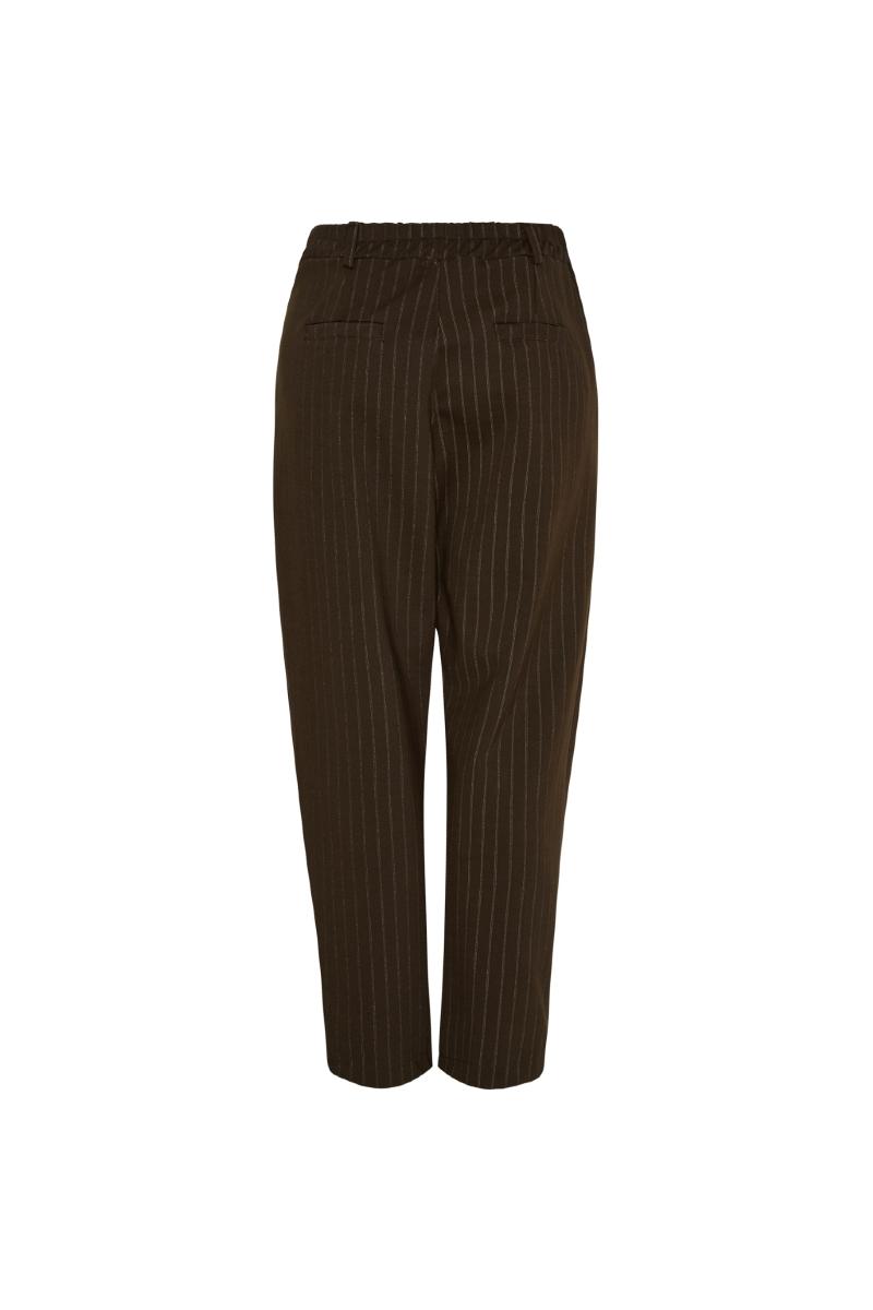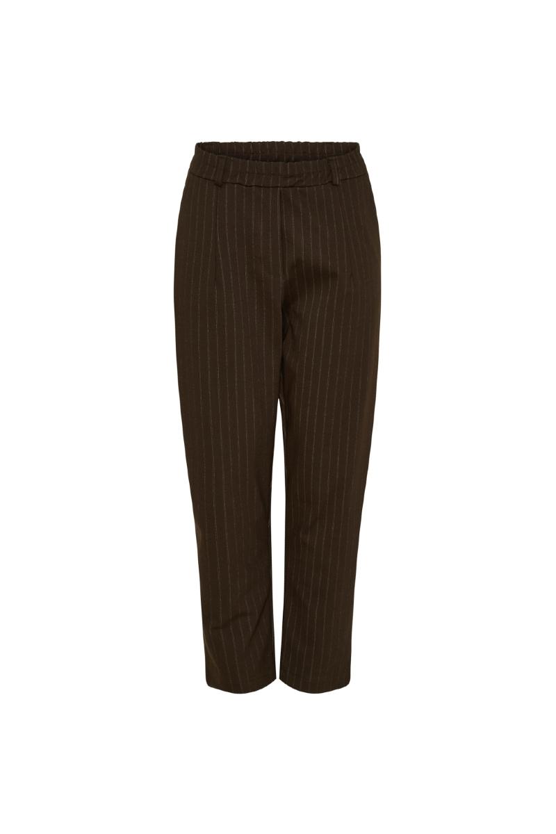 Kritstrecksrandiga byxor med resår i midjan.