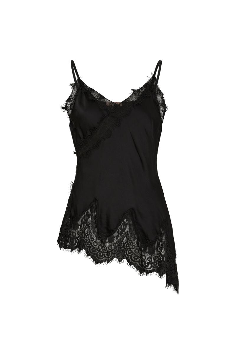 Glansigt linne på snedden med spetsdetaljer.