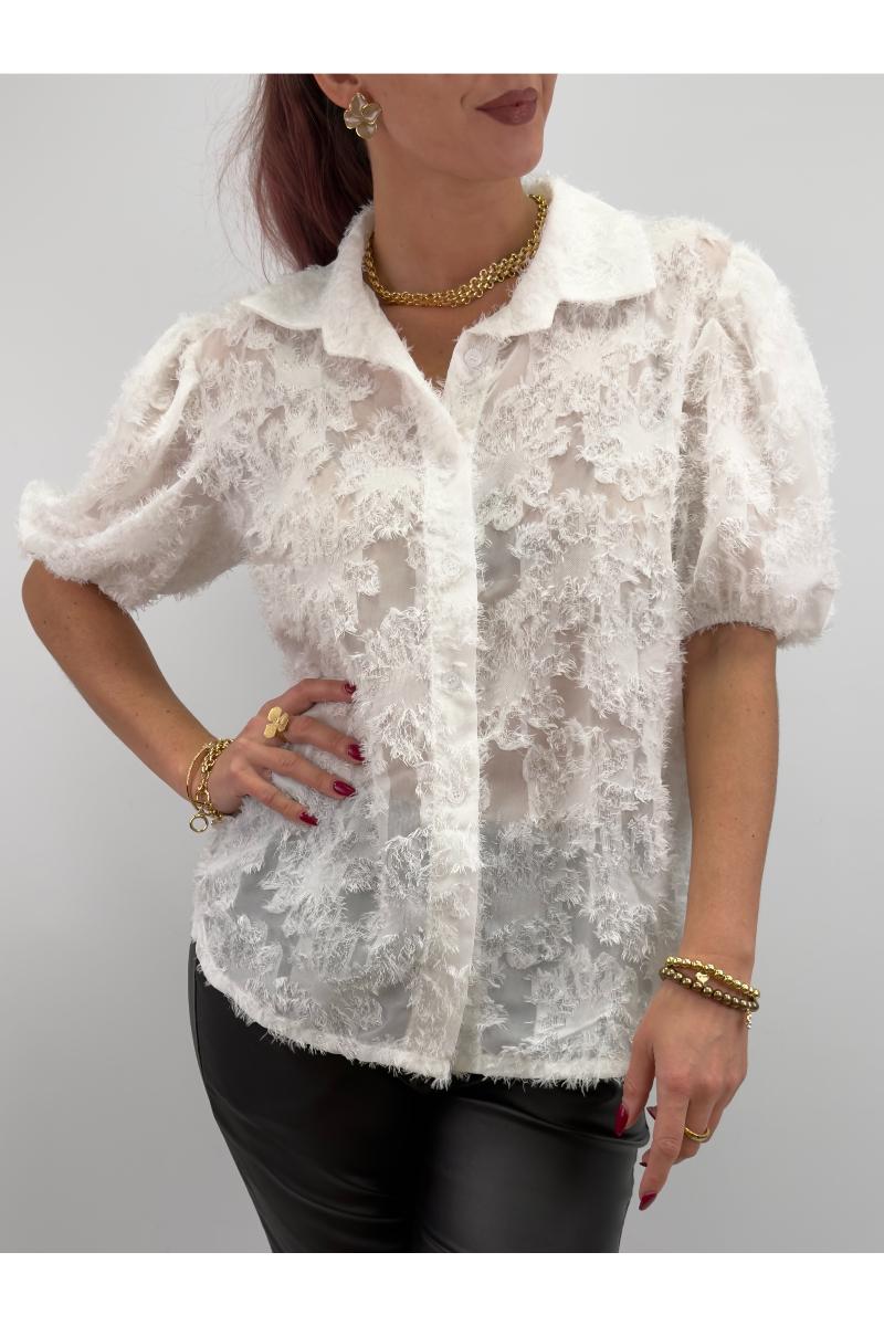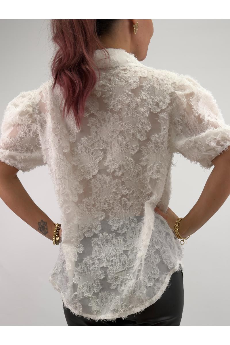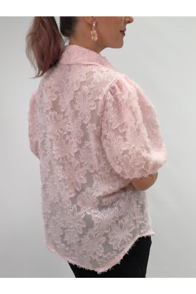 Unik blus med kort puffärm och vackert mönster.