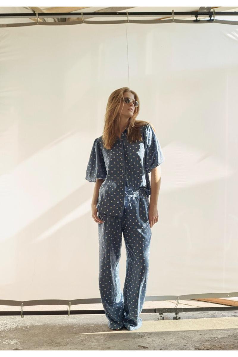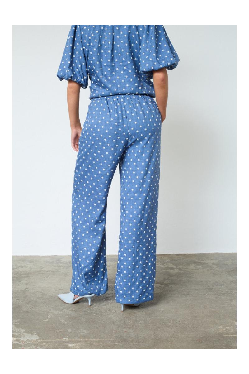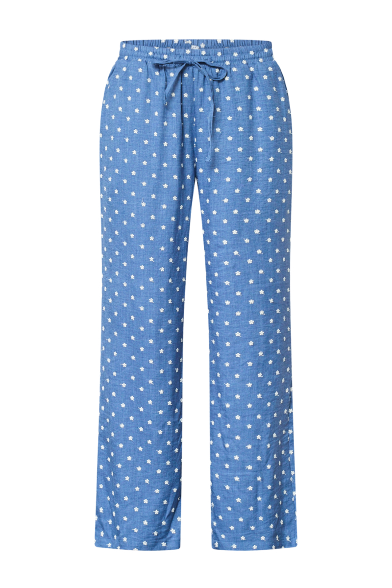 Vid mjuk byxa med broderade blommor. Resår i midjan.