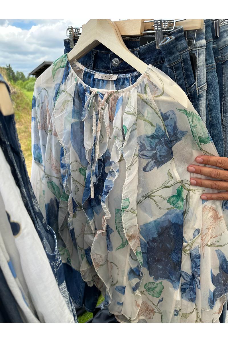 Flowy blus med volang fram och en kortare arm med volangavslut.